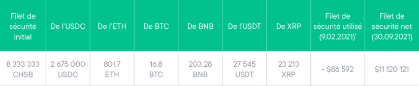 SwissBorg a mis en place un programme de filet de sécurité d’1 million USD en CHSB (8 333 333 CHSB) pour se protéger contre le risque de smart contract, et nous avons toujours investi l'équivalent de 25% des revenus du rendement maximum dans ce programme, pour nous assurer qu'il se développe parallèlement aux investissements de notre communauté.