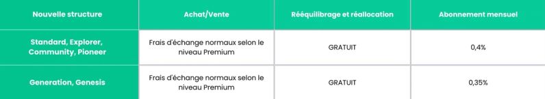 Nous disons "au revoir" aux frais de rééquilibrage, "goodbye" aux frais de réallocation et "chömmed guet hei" aux frais d'échange élevés. Il ne restera plus qu'un abonnement fixé à 0,35% par mois pour nos utilisateurs Premium.