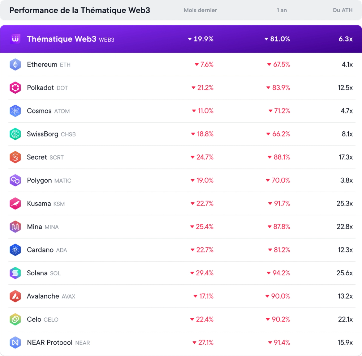Tout d'abord, la performance de la Thématique Web3 est comparée à celle de tous les tokens individuels qui la composent. L'avantage évident de la diversification par le biais des Thématiques est que, même si quelques tokens surperforment la Thématique Web3, il peut être difficile de les sélectionner.